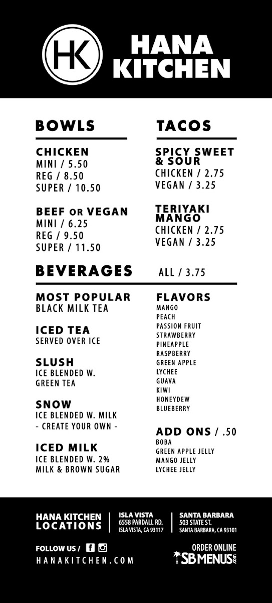 If you're in Isla Vista and craving something fresh and flavorful, Hana Kitchen - Isla Vista Menu is a must-try. Located at 6558 Pardall Rd, this cozy spot offers a delightful mix of Japanese-inspired dishes that will leave you coming back for more. Whether you're in the mood for a light bite or a satisfying meal, there's something here for everyone. From vibrant sushi rolls to savory ramen bowls, each dish is crafted with care and full of flavor. The menu features a variety of options, including vegetarian and gluten-free choices, so you can easily find something that suits your taste. Every plate is made using high-quality ingredients, ensuring that each bite is just as delicious as the last. So, grab a seat, relax, and explore the wonderful flavors that await at Hana Kitchen!